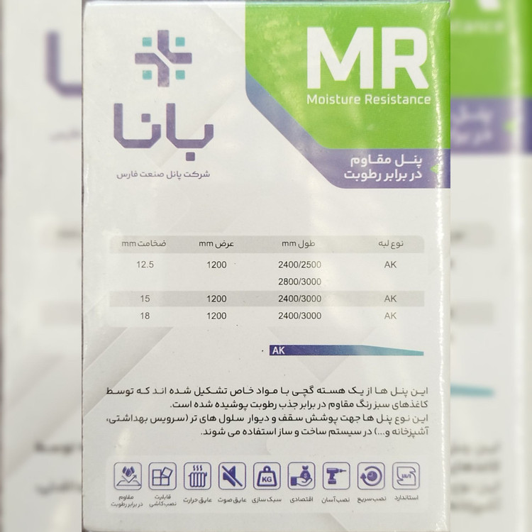 این نوع پنل از هسته گچی با مواد خاص تشکیل شده است که توسط کاغذهای سبزرنگ مقاوم در برابر جذب رطوبت پوشیده شده است. این پنل ها جهت پوشش سقف و دیوار سلول های تر (سرویس های بهداشتی، آشپزخانه و...) در سیستم ساخت و ساز خشک شرکت بانا استفاده می شوند.